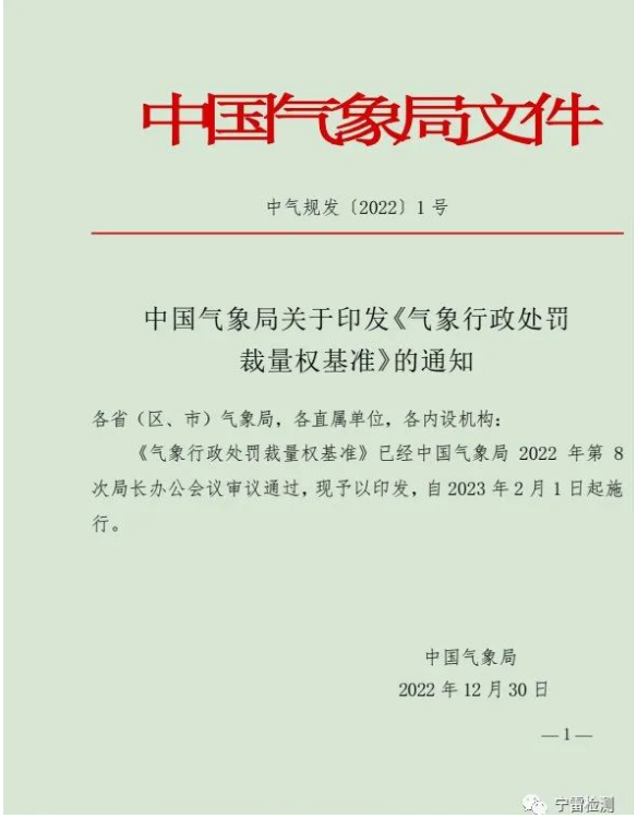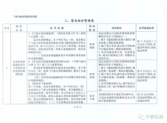 為了規(guī)范氣象行政處罰裁量權(quán)行使,促進依法、合理行政,維護公民、法人和其他組織的合法權(quán)益,依據(jù)《中華人民共和國行政處罰法》、《氣象行政處罰辦法》等法律法規(guī)規(guī)章和《國務院辦公廳關(guān)于進一步規(guī)范行政裁量權(quán)基準制定和管理工作的意見》,結(jié)合氣象工作實際,中國氣象局制定了《氣象行政處罰裁量權(quán)基準》,自2023年2月1日起施行。其中第二款對雷電防護管理類氣象行政處罰裁量權(quán)基準做出以下規(guī)定: